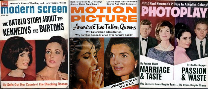 Much as popcorn kept movie theaters afloat after the advent of television, so Jackie Kennedy salvaged the movie magazines. She never starred in a movie but she featured in the movie magazines to such an extent that  in 1962, Variety enthusiastically hailed her as the “world’s top box office femme.” The prevailing editorial policy of all of the 40+ movie magazines then became this: to regularly feature the First Lady alongside “any lady or gentleman of the screen and television who misbehaved.”