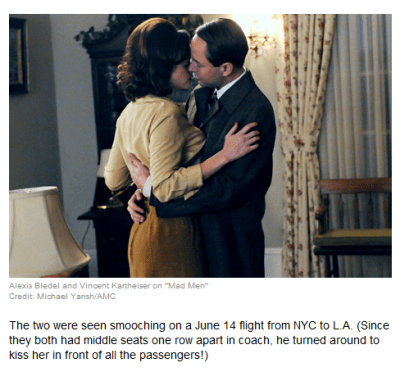 so, our girl rory gilmore is dating pete campbell (real world trans: alexis bledel is dating vincent kartheiser). well, maybe not DATING him but, at the very least, making out with him on cross-country flights.