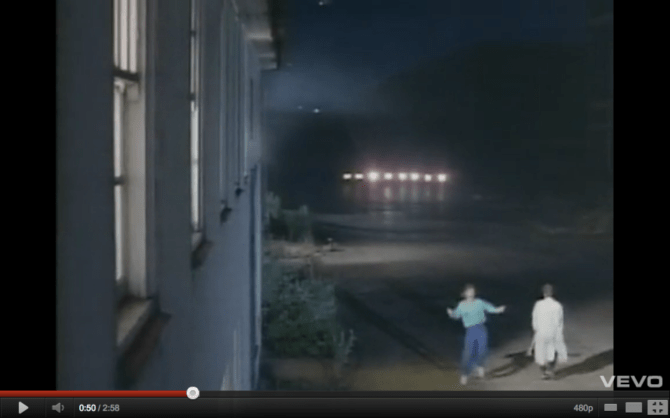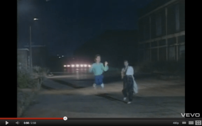 this is a music video of many tensions (we’ll get to The Big One in a sec), but i find myself terribly distracted by the vaguely threatening cars. why are they there? the most obvious course of action would be for them to be driving towards the great dance party that is unfolding here in The Streets and for people to leap forth and for a block party to bust out all mariah carey “fantasy” style. but no. they just sit there, impotently sinister.