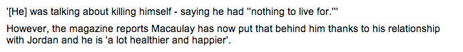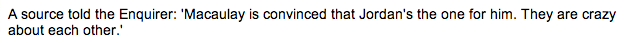 that the timing of the kunis/kutcher wedding is dependent upon how well they’re able to stand their kid, BUT… macaulay is totes committed to jordan because their relationship is the first he’s had since he and kunis broke up?