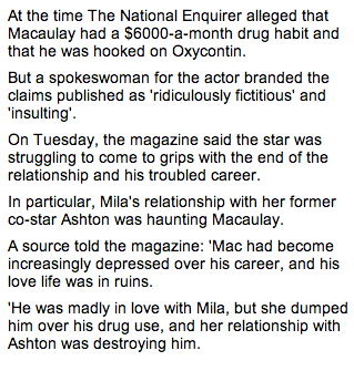 if you’ve been around here with any regularity in the last year, you know i’m rather taken with the daily mail‘s accounts of macaulay culkin’s love life. rightfully so, because they are amaze. predictably, given mila kunis’s recent engagement to that man who dumped demi moore, the DM decided to check in and see how mac’s doing. he was not, as it turns out, drowning his sorrows in ‘sad’ ‘by himself’ ‘on his own’ ‘lunch for one’ burritos from taco bell. oh but no, no. now it’s a MAD DASH TO THE ALTAR!!!