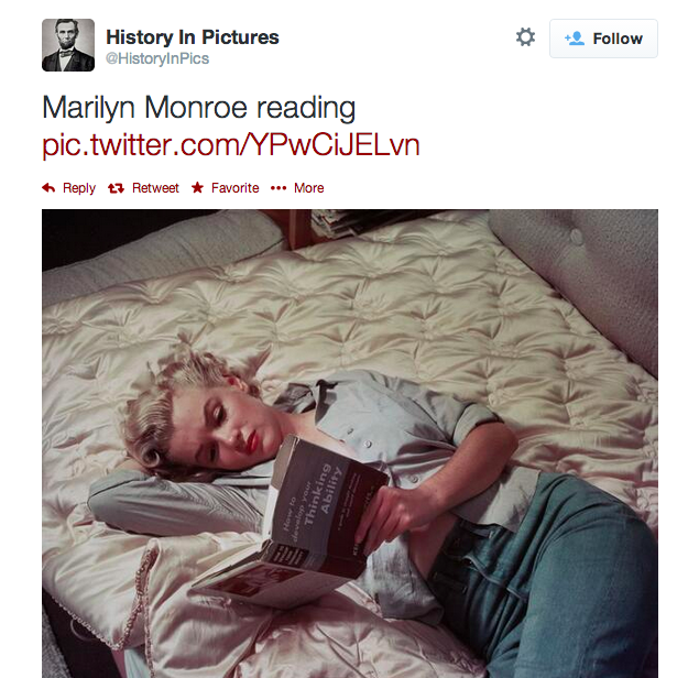 (and this isn’t an attack on @HistoryInPics: their captions simply say what the photo shows. so the caption ‘ronald reagan wearing sweatpants on air force one’ is linked to a picture showing ronald reagan wearing sweatpants on air force one. however, the phrase ‘marilyn monroe reading’- a referent commonly used on the internet – is a demeaning short-hand we should be more aware of… hence, this exploration of it here as prompted by @HistoryInPics use of it today.)