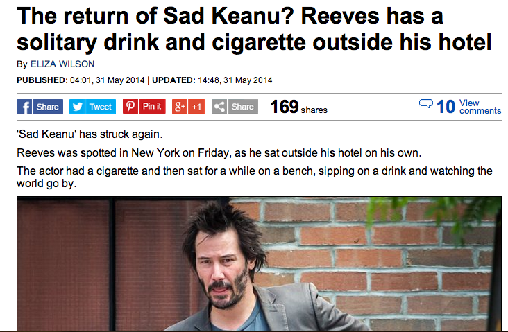 ok, so, of the out-pouring of internet love that followed these pictures then the guardian wrote that “We want to protect Keanu because we can tell he’s good. Most excellent, even.” i do not know that i’ma buy that, but it is provocative. sad keanu, that is.