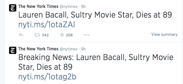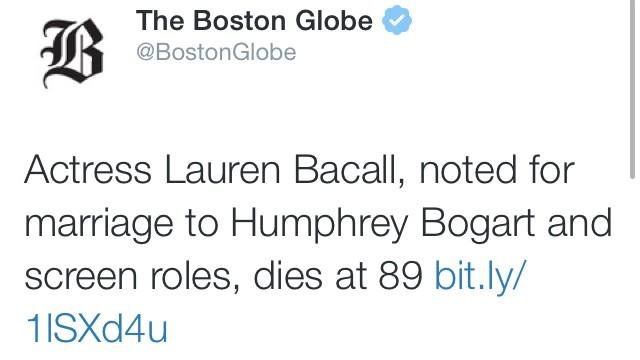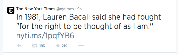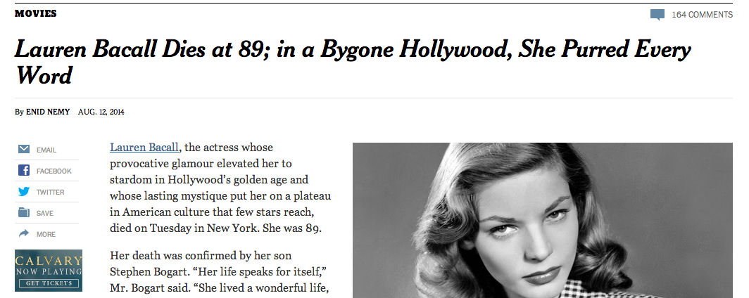 but it’s increasingly problematic to assume that something written about a life in, say, 1994 could simply be updated with a quote from 2009 and another from 2011 and be dated 13 august 2014. obituaries provide snapshots of the times in which we live and so we read this and think it reflects not only bacall’s life but our assessment of her now, not in 1994. would that change at all if someone working at the times today were to sit down this morning and ponder bacall’s legacy and write something from scratch? maybe not. but, in that chain of events, there’s more room for the possibility that it would. and there’s the possibility that, in looking at her story again, something new might be seen.