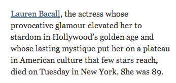 contemporary reports are the first layer of myth-making in a life. then memoirs then an obituary. to give credit where credit’s due, in its first paragraph (the money-shot of any obit, as my professor called it in grad school) the times allows bacall to be her own person: