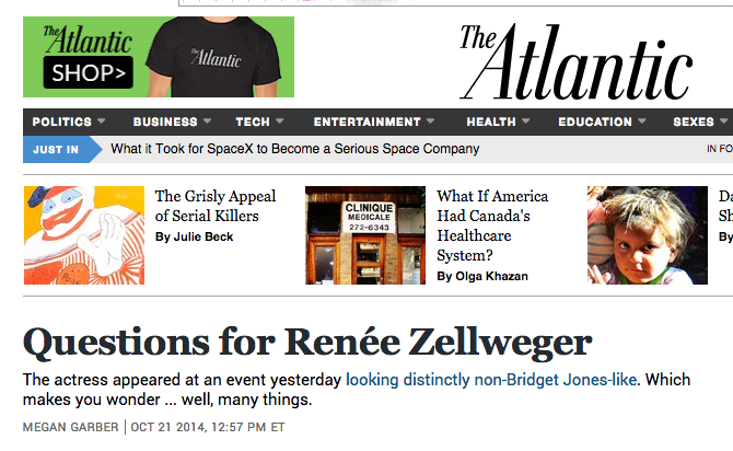 aren’t we still treating renée zellweger differently than we do brad pitt or tom cruise or george clooney? in looking at her face, worrying about her face, tweeting about her face and telling others to look at her face too, aren’t we still holding renée zellweger to a different standard than we hold all of the men in hollywood (with the exception of bruce jenner)?