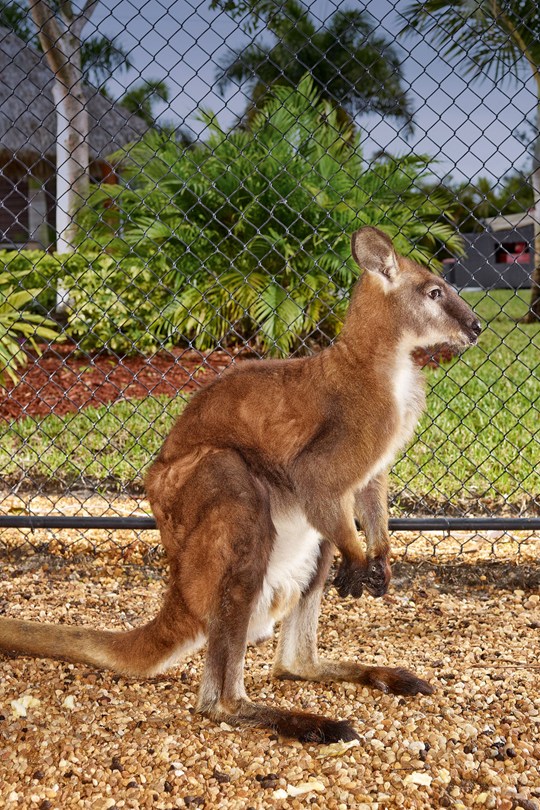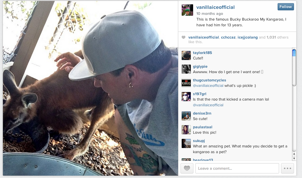 predictably, there’s some dramaz here. turns out wild animals don’t always love confinement, so bucky buckaroo the wallaroo has escaped a couple times… perhaps most memorably in 2004 when he went tooling around town with vanilla ice’s goat.