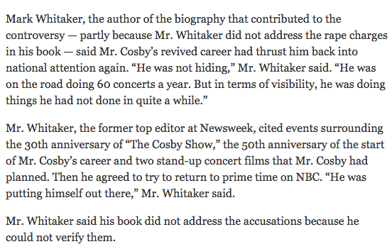 books take a long time to come to fruition. whitaker and his editors had years to change their minds and put this in and they did not. (probably because whitaker had access to cosby, which raises the secondary question of how biographical ethics are abandoned for access…)