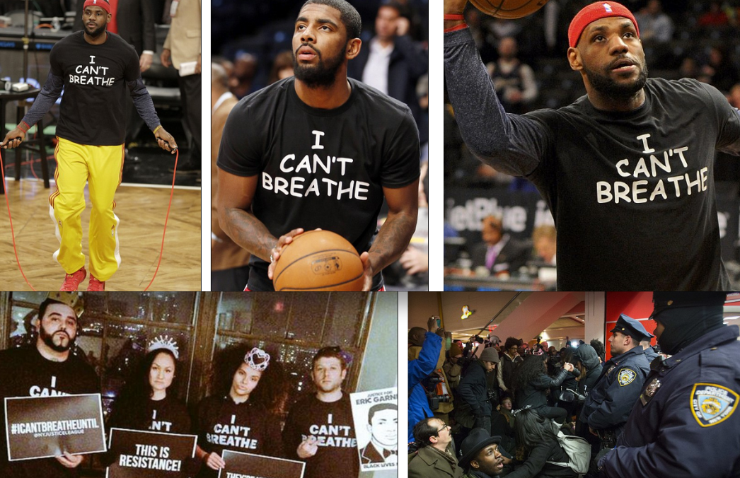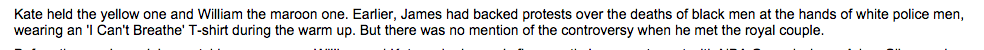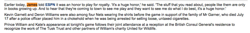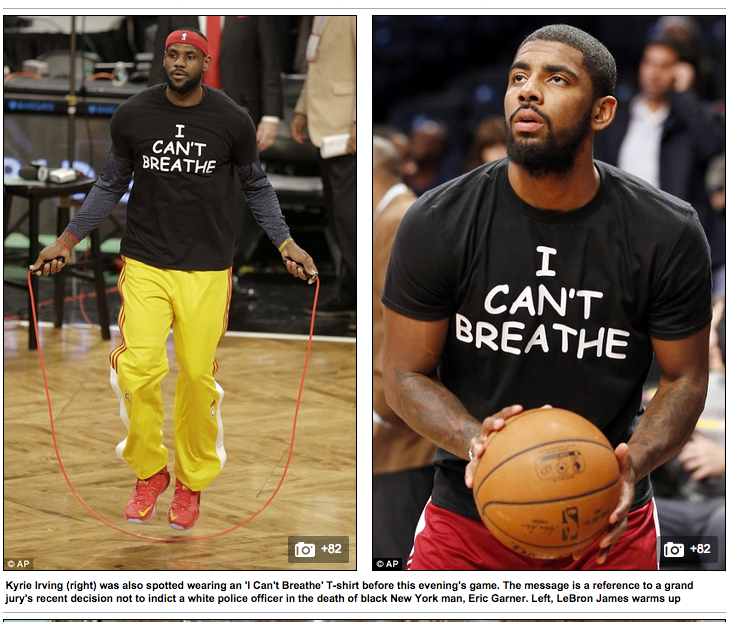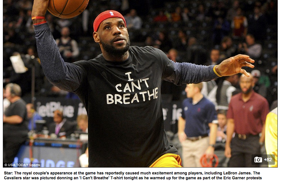and yes, even that contention on the slippage of everyday concerns into the celebrity realm is problematized here by the fact that half the slippage here is celebritized by dint of it’s being lebron and his teammates wearing “i can’t breathe” t-shirts rather than non-celebrity protesters. maybe the daily mail would have included this element of the duke and duchess story without that, but there are 6 photos having to do with garner/brown and 3 are of athletes, so it seems unlikely.