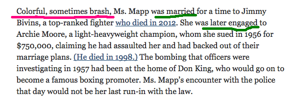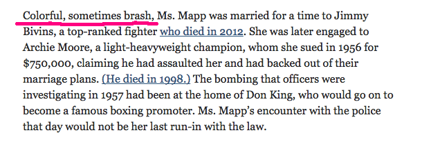 to return to my earlier giant unsupported claim- that the writing in obituaries culturally sets us back- behold: if we’re trying to make sense of this assessment in the opening clause and place it to some context in the paragraph, then she was “colorful, sometimes brash” because she ran with boxers. there’s some casual but nasty gender, race and class implications wrapped up in those three words and their appearance in this paragraph on this african american woman’s relationship with three african american men. i doubt william yardley or the NYT gave much thought to this seemingly throw away line- the legal stuff is clearly their main concern and why they’ve run the obit at all- but it’s this casualness, this lack of attention to the way we’re writing these things (also reflected in the fetishization of the completely bizarro way they are produced), the words we’re using and the tone.