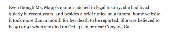 well, there are hints. she “defied” police, “resisted a search,” “refused to admit them” in “a small gesture of defiance” that had wide-ranging legal consequences. she stuffed a warrant down her shirt and was called “belligerent.” there were sexually explicit materials in the house. she lived “quietly” after the ruling.