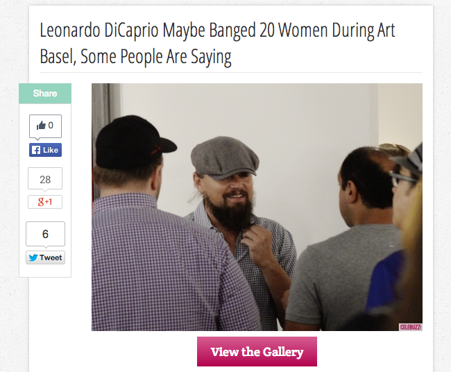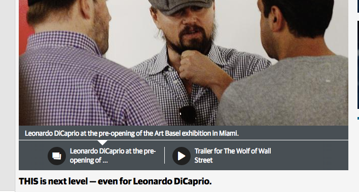 following the trail of links we go from the telegraph (“THIS is next level — even for Leonardo DiCaprio”) to the new york daily news, which is where rando seems to have orginated, as “a spy in South Beach during Art Basel”/”our awestruck snitch.”