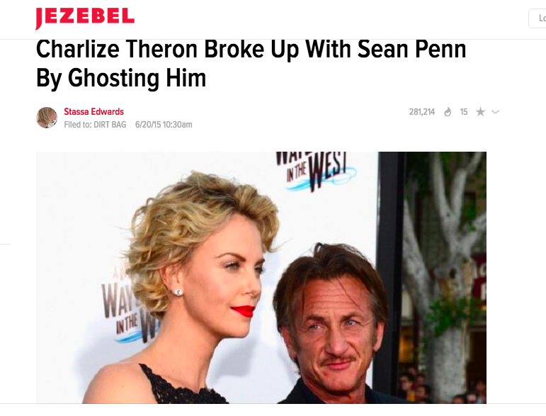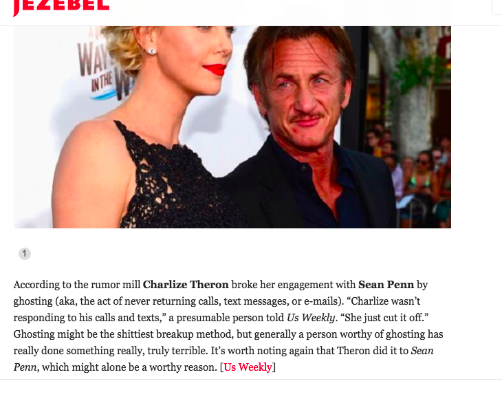 the jezebel post literally begins with this phrase: “According to the rumor mill.” and if we, you know, actually look at the post, it’s immediately clear that jezebel isn’t reporting that theron ghosted penn. jezebel is reporting that us weekly reported theron ghosted penn.