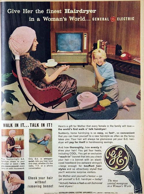 and she also noted: “A woman beneath a dryer is in a brief, secluded little world of her own. She can’t hear the conversation and laughter in the room about her. The time she spends there is all her own. To most busy, active homemakers and business women time spent quietly under the warm shelter of a soothing dryer is a peaceful experience.”