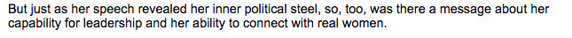 i have received no messages about her leadership or ability to connect. nor does the next paragraph illuminate either of these, though it does attempt a blow for gender parity:
