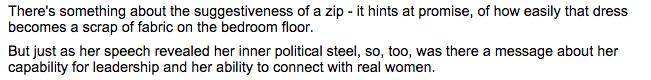 her clothes are on the floor. and i thought we were supposed to forget her speech. now, after we’ve undressed her, we’re supposed to remember her speech and note her “inner political steel”?
