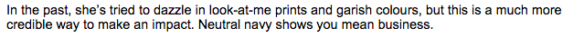 for real, hasn’t this article just made you decide once and for all that if you’re ever in a position of power, you will dress like a man? it is so not worth it. already, if ever i had political aspirations, they have been scotched by this article, as has my desire to wear any of the dresses i own with exposed zippers.
