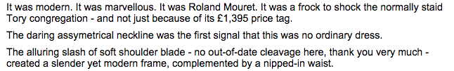 the piggate discussion emerged from the publication of a book and had to do with an actual news story- a gossipy one, but news nonetheless. in contrast, the daily mail‘s article on may’s dress emerged from may wearing a dress, and the may reporting is actually a pivot away from a news story (her speech at the conservative conference). this is a story featured in “femail” so perhaps this shift is expected, but it’s still worth noting.