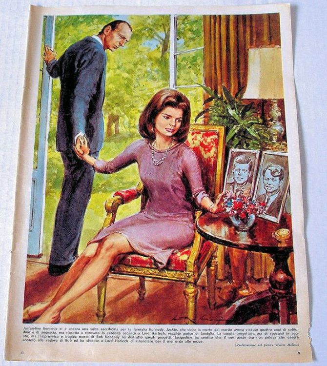 (via pinterest… ‘A 1968 sketch from the Italian magazine “Grand Hotel”, showing Jackie wanting to marry Lord Harlech, but still emotionally drawn to the tragedies she endured. This was the way the public wanted her to marry – a sophisticated aristocrat who was also a widower.’)