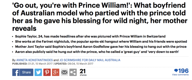 there is, of course, the standard daily mail negging of the woman with whom william was photographed exchanging a high five at a lunch where alcohol was on the table.