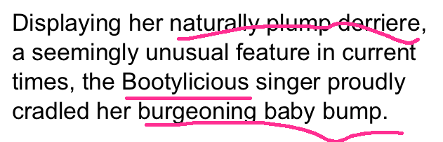 the thing is this: in all that writing about “her blossoming bump and bodacious booty,” “her enviable figure,” her “hot selfies” and “smoking hot” look, “her naturally plump derriere,” “her burgeoning baby bump,” her “adorable” daughter and “stunning mum,” did you get any sense that we were talking about human beings here?