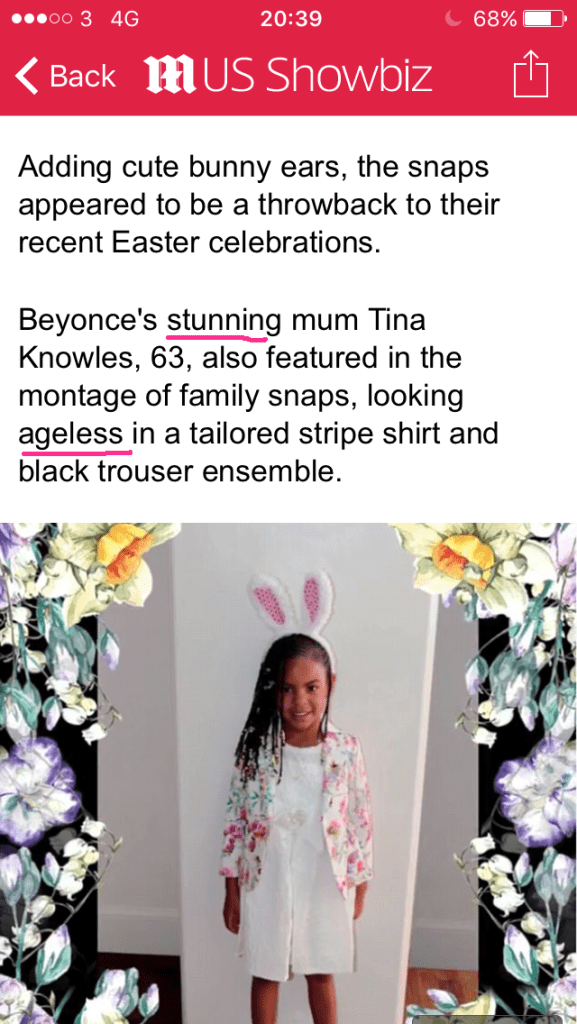 it is standard in gossip journalism to be constantly reminded of everyone’s ages. (this is why i’ve a startlingly encyclopedic knowledge of obscure celebrity ages- every time i read about jessica beale, i am reminded she is now 35.) already this article informed us that beyoncé is 35, jay z is 47, blue ivy is 5 and the twins are a few months away from being born. so it’s not odd that we would be reminded tina knowles is 63.