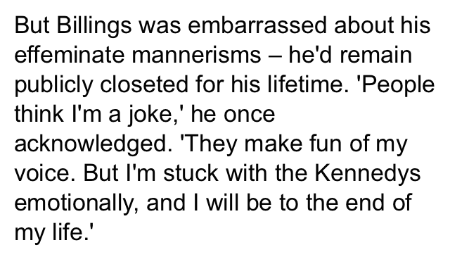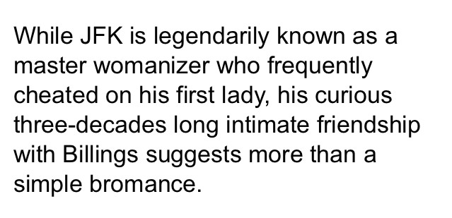 there is perhaps some archival evidence to suggest billings had romantic feelings for JFK. i will allow that. letters. a reference to something written on toilet paper and thrown away. but it’s all pretty ephemeral. there is no written documentation that explicitly says anything.