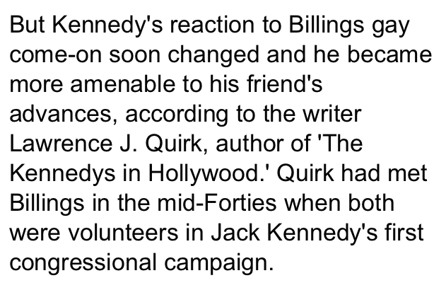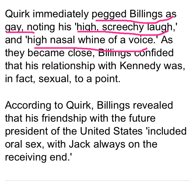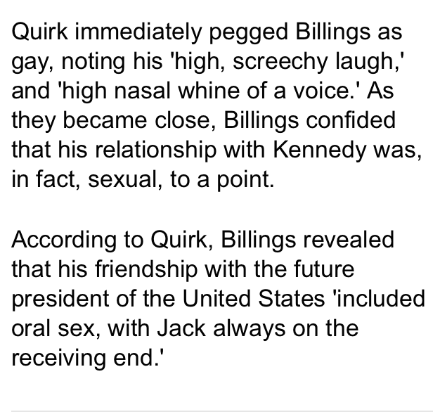 this story is, i would guess, maybe coming from quirk in the 1990s or early 2000s (he died in 2014). oppenheimer says quirk met billings in the late 1940s but doesn’t say when billings allegedly recounted details of his relationship with JFK to quirk or under what conditions.