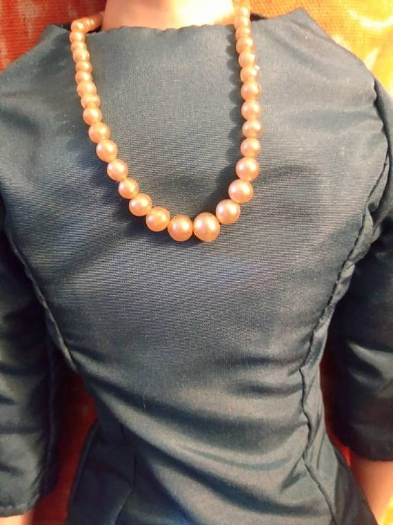 i imagine the pearl necklace (which [enter factsOline] is far longer than any she ever wore, fyi) is indeed glued in the back and hangs loose here.