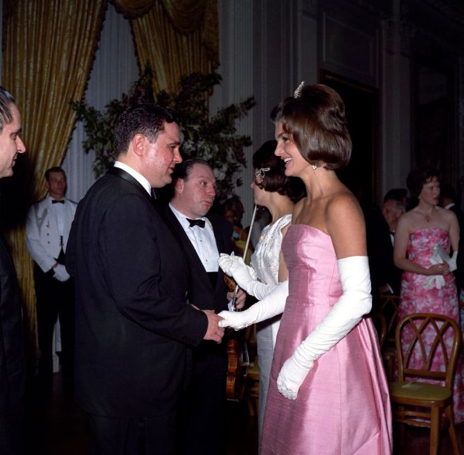 (Jacqueline Kennedy on her way to the State Dinner with Her Majesty the Queen Elizabeth II)