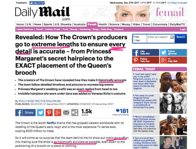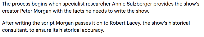 ONE MAN, people. one man, who is deemed an expert because he is one of many people who first wrote a book about the queen twenty years ago, vets the script to ensure historical accuracy.