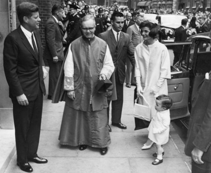 5th June 1961: US statesman John F Kennedy (1917 – 1963) (left), 35th president of the USA, arrives at Westminster Cathedral, London, for the christening of his sister-in-law Princess Radziwill’s daughter. His wife Jacqueline Kennedy (1929 – 1994), holding Princess Radziwill’s other child by the hand, is on the right. (Photo by Keystone/Getty Images)