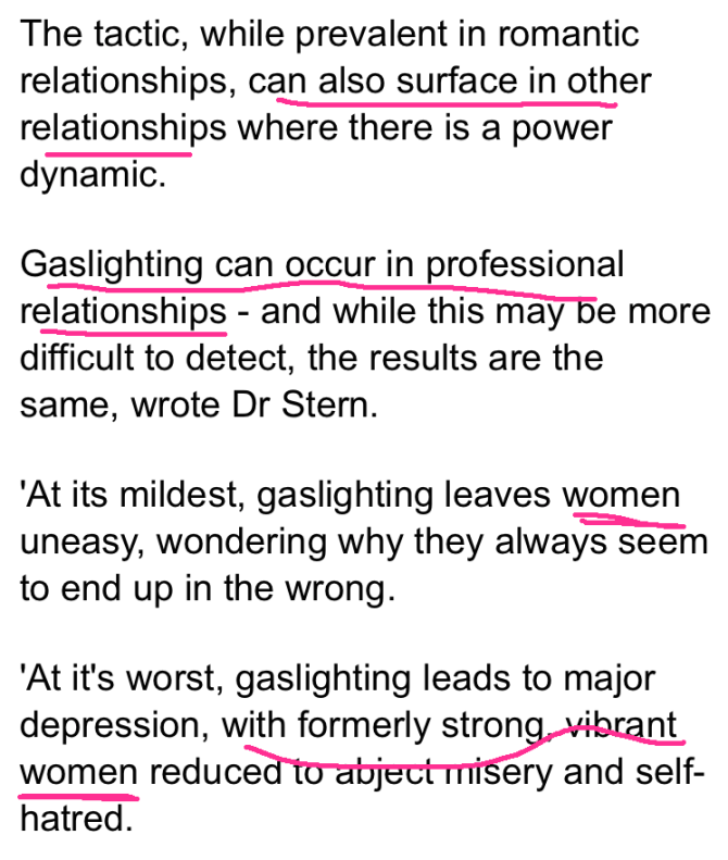 i’m not arguing that gaslighting doesn’t affect women. i’m arguing that portraying gaslighting as a “women’s issue” and focusing exclusively on the victims and effects of gaslighting while suggesting it is a part of “modern dating” and saying absolutely fuck-all about the perpetrators of it is pernicious.