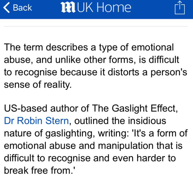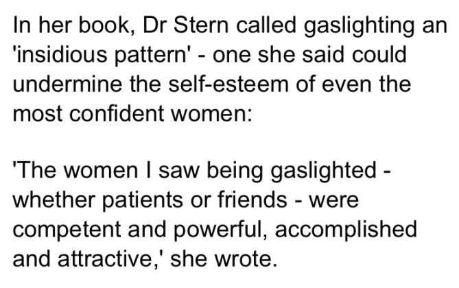 this article is basically a PSA on gaslighting and an advert for this book (WHICH WAS PUBLISHED IN 2007!!!! which begs the question of why the mail is hyping it here [oh, because it was reprinted in january of this year, which i suppose is further testament to the au currance of gaslighting]) :