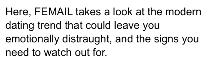 BUT. the mail exclusively looks at gaslighting as a “modern dating trend” that affects women without once asking who the fuck is doing all this gaslighting of women.