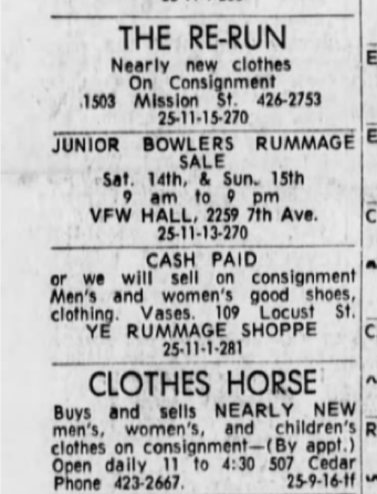 we’re talking about a time when women could not apply for credit without a male co-signer. that wasn’t possible until the passage of the equal opportunity credit act of 1974, which went in effect in june 1976. and so, in the decades before that, for women of all classes, clothes consignment could be a way of earning quick cash.