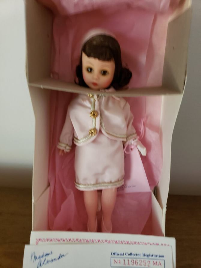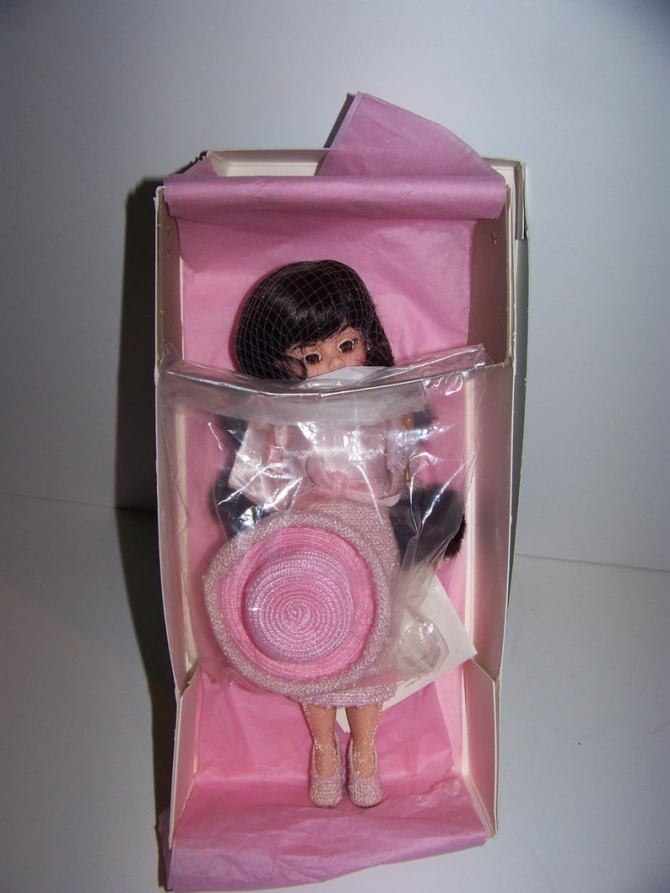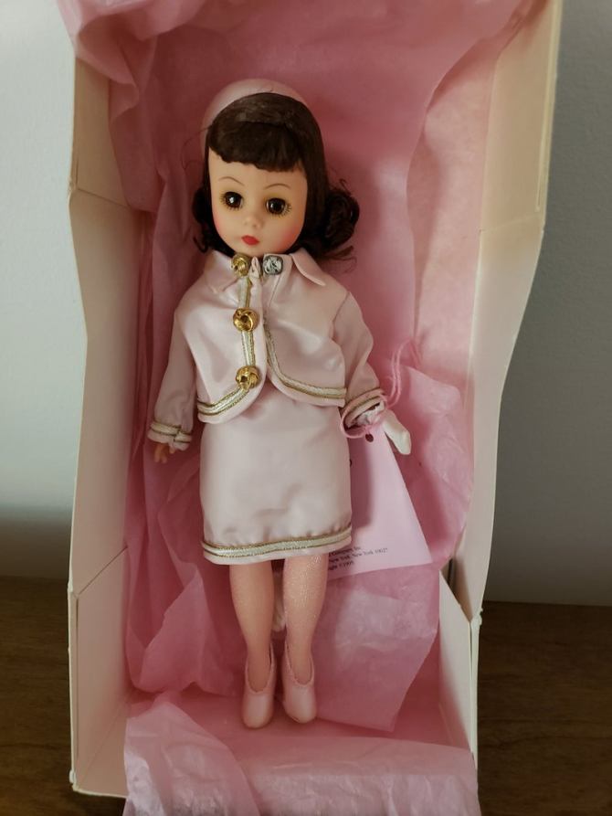 this is the madam alexander jackie doll of the “pre-2000s” apparently. i do not know what this outfit is, historically speaking, though i appreciate the jauntiness of that unbuttoned top button.