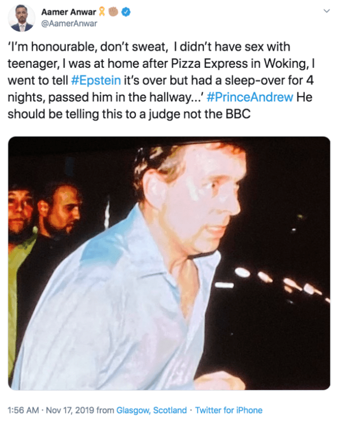 because andrew said he knew he hadn’t had sex with virginia giuffre, then age 17, because– and i am not even joking– he had been at a pizza express in woking on the night in question.